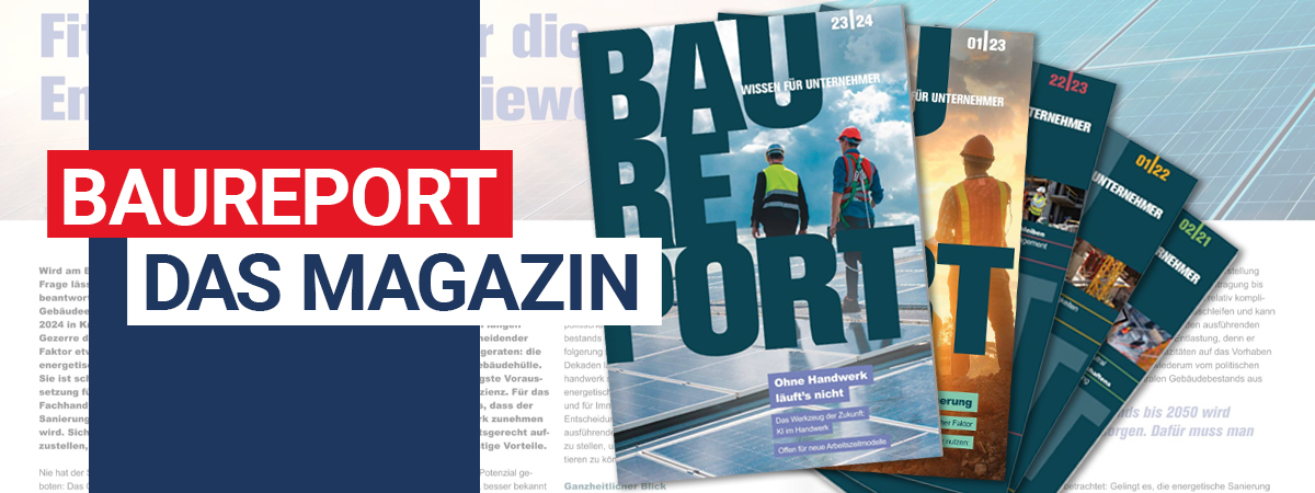 Das Magazin BAUREPORT sitzt direkt am Puls der Baubranche: 52 Seiten vollgepackt mit den neuesten Entwicklungen und Dynamiken aus dem Handwerk.